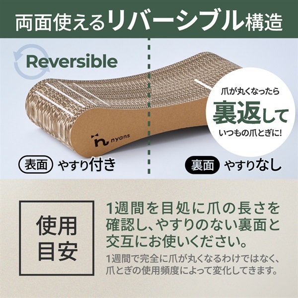 猫ちゃんの爪とぎの頻度や爪を研ぐ場所によって削れる早さに個体差がでます。ご了承ください。