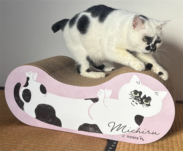 絵がミチルちゃんそのままで本当に可愛いです。大きくずっしりしているので大柄な子が飛び乗っても安心だと思います。激しめに爪とぎしても研ぎカスもほとんど出ないので本当に困ります。ゆるくカーブした形が猫ベッドにもなっていい感じです。