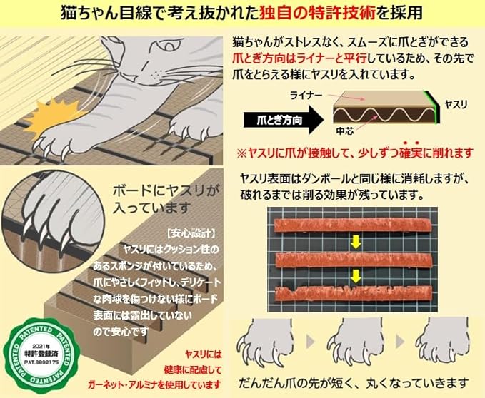 調べていくうちに、一つの情報に出会った。やすりつき爪とぎの特許を持つ株式会社NeCoNeさんの存在を知ったのだ。爪とぎに天然ガーネットのやすりを組み込むことで、猫が爪をとぐだけで爪先が自然に丸くなるという仕組みだった。